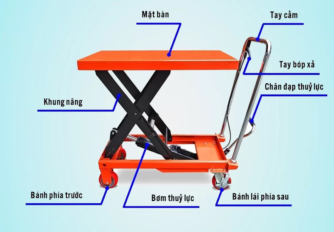 Bàn nâng tay hoạt động dựa trên cơ chế bơm thuỷ lực bằng sức người (đạp chân hoặc dùng cần gạt tay).